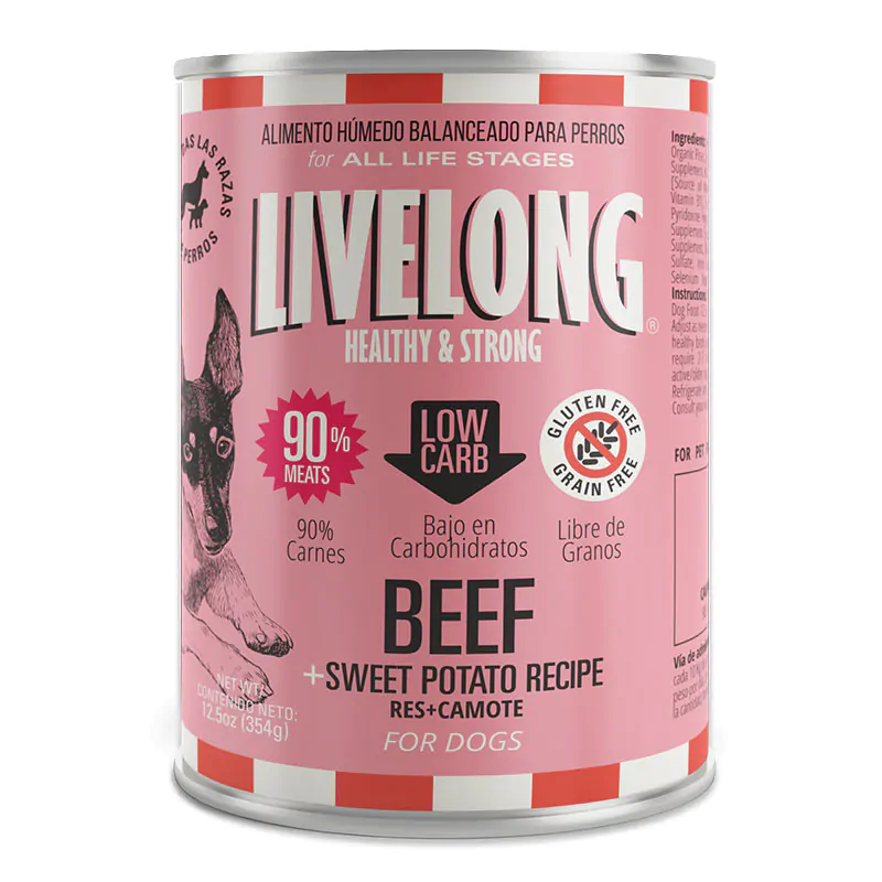 Grain-free source of nourishment appropriate for the most discriminating palate, delivering a mouth-watering taste your dog will love and enjoy. Our food is made with high quality BEEF, mixed with organic sweet potatoes, organic carrots, and organic peas, cooked in its own duck broth. This formula is perfect for dogs with skin and or food allergies, and can be used exclusively as superb source of nutrition or mixed with dry food.